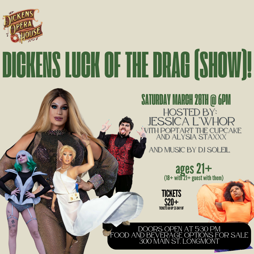 š³ļøāš Welcome to theĀ Dickens Drag Show! Get ready for a fabulous evening filled with glitz, glamour, and jaw-dropping performances. Join us onĀ Sat, March 28th, 2026Ā atĀ 6:00 PMĀ at theĀ Dickens Opera HouseĀ on Main Street in Longmont, CO, USA.
