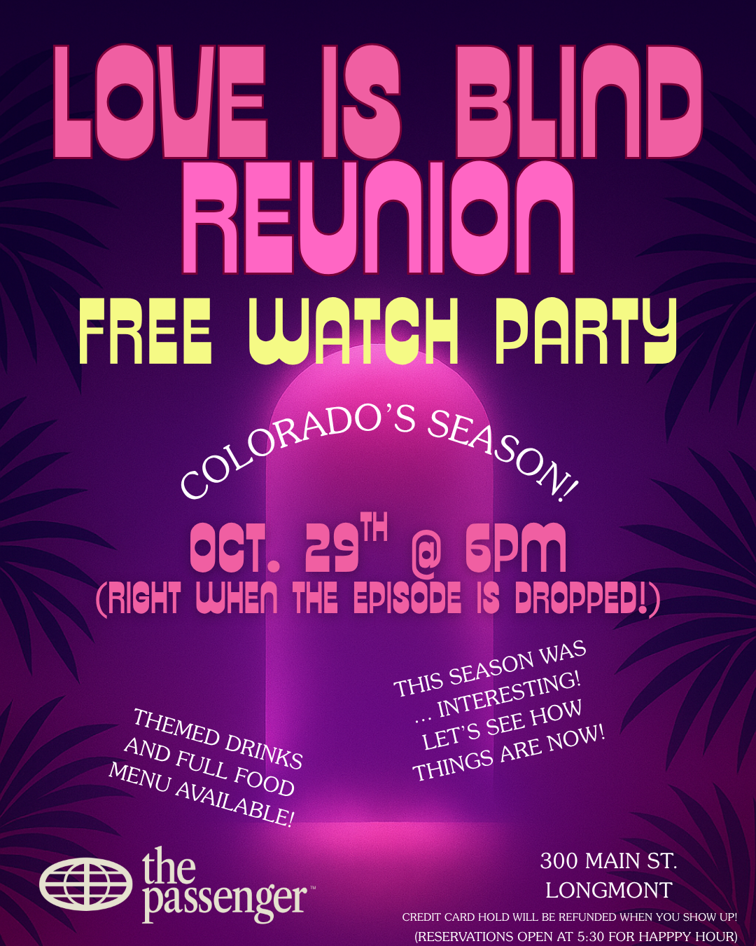 🌴✨ LOVE IS BLIND REUNION WATCH PARTY ✨🌴 Colorado, it’s our season since it was filmed in Denver—so let’s watch it together at The Passenger! This season was... well interesting. Let's see how the reunion plays out. 💌 Reservations open at 5:30 for happy hour specials till 6 pm! Credit card hold will be refunded...